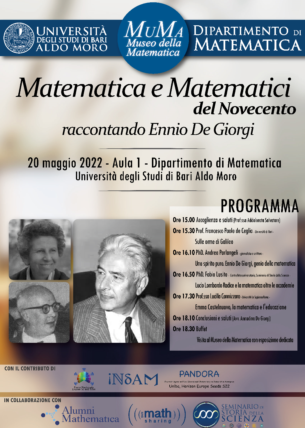 20 maggio 2022 – evento in presenza Matematica e Matematici del Novecento raccontando Ennio de Giorgi Venerdì 20 Maggio 2022 ore 15:00, Aula I Dipartimento di Matematica Ore 15.00 Accoglienza e saluti: Addolorata Salvatore Ore … Read More
