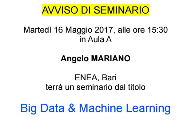 Big Data & Machine Learning Il 16 Marzo nell’Aula A del Dipartimento Interateneo di fisica il Dott. Angelo Mariano, dell’ENEA Bari, svolgerà un seminario dal titolo “Big Data e Machine Learning”. L’esplosione e la rapida … Read More