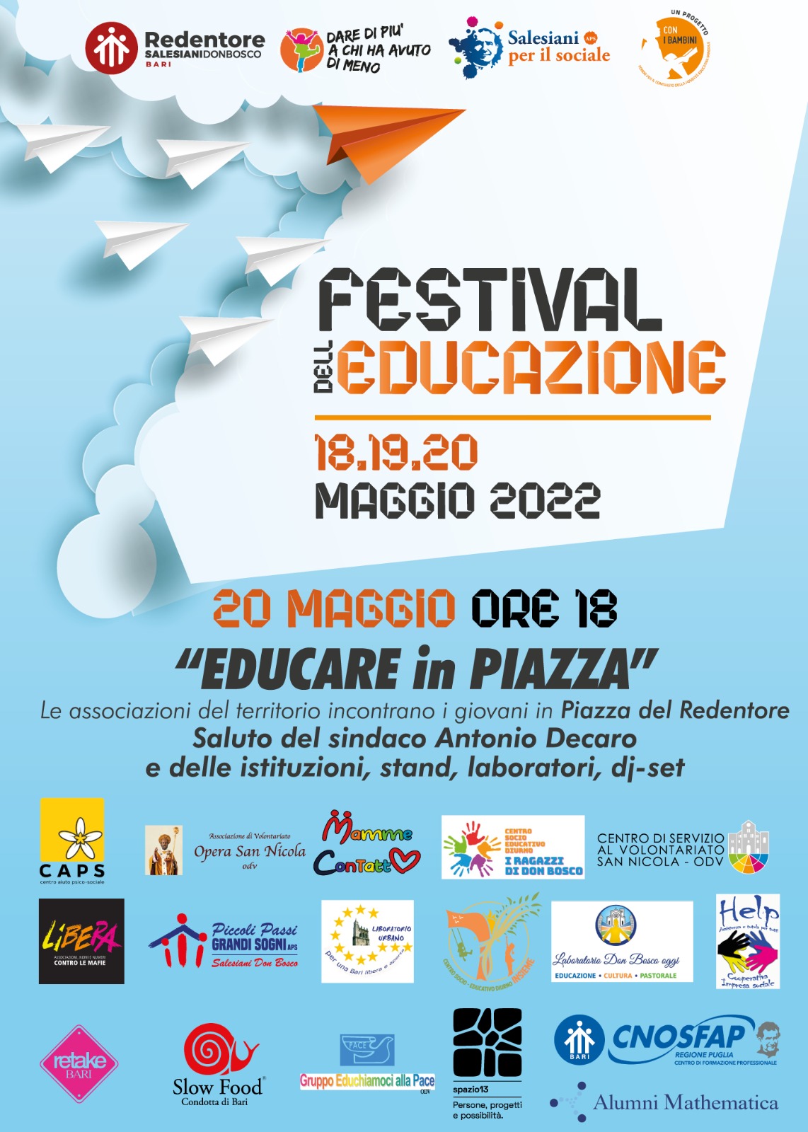 20 maggio 2022 – piazza redentore Anche Alumni Mathematica al Festival dell’educazione del Redentore Venerdì 20 Maggio 2022 ore 18:00, Piazza del Redentore Via Martiri d’Otranto 65 Bari Dalle 18 del 20 maggio una giornata … Read More